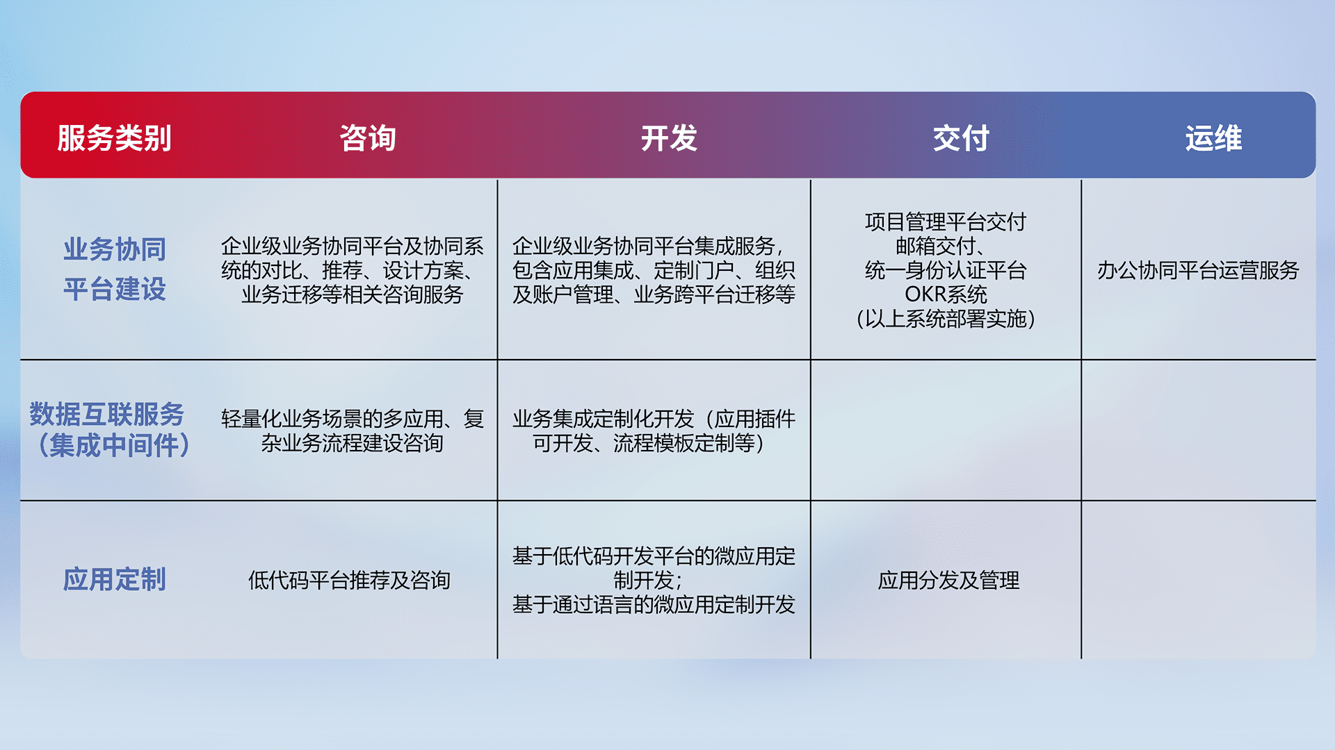针对钉钉、、、、企微、、、IDaas等平台级产品提供产品的规划、、、方案、、、交付、、、、定制化开发等服务,,,实现如统一协同办公、、、智能客户服务、、混合会议管理、、智能数据查询、、、等业务场景,,,实现数字化转型。。